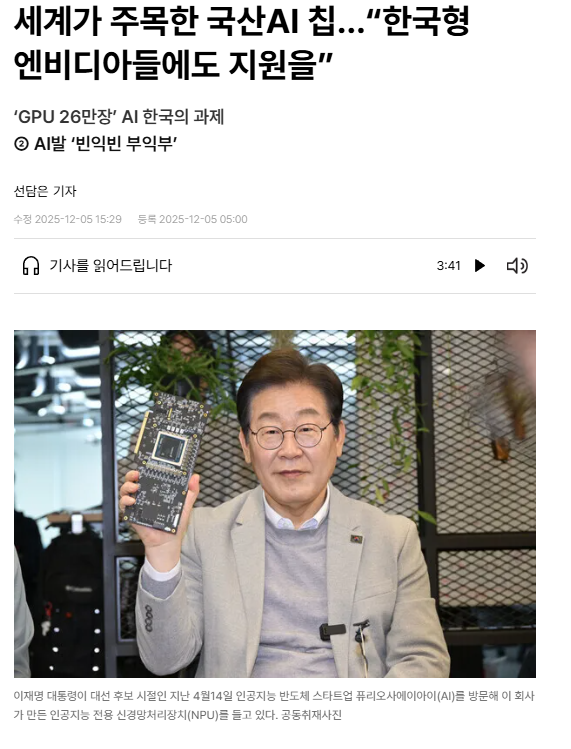 🇰🇷 정부 "한국형 엔비디아 키운다"... 국산 NPU 전폭 지원 엔비디아 GPU 확보와 함께 국산 AI 반도체 실증 사업 확대, 정책 수혜 기대 (한겨레)