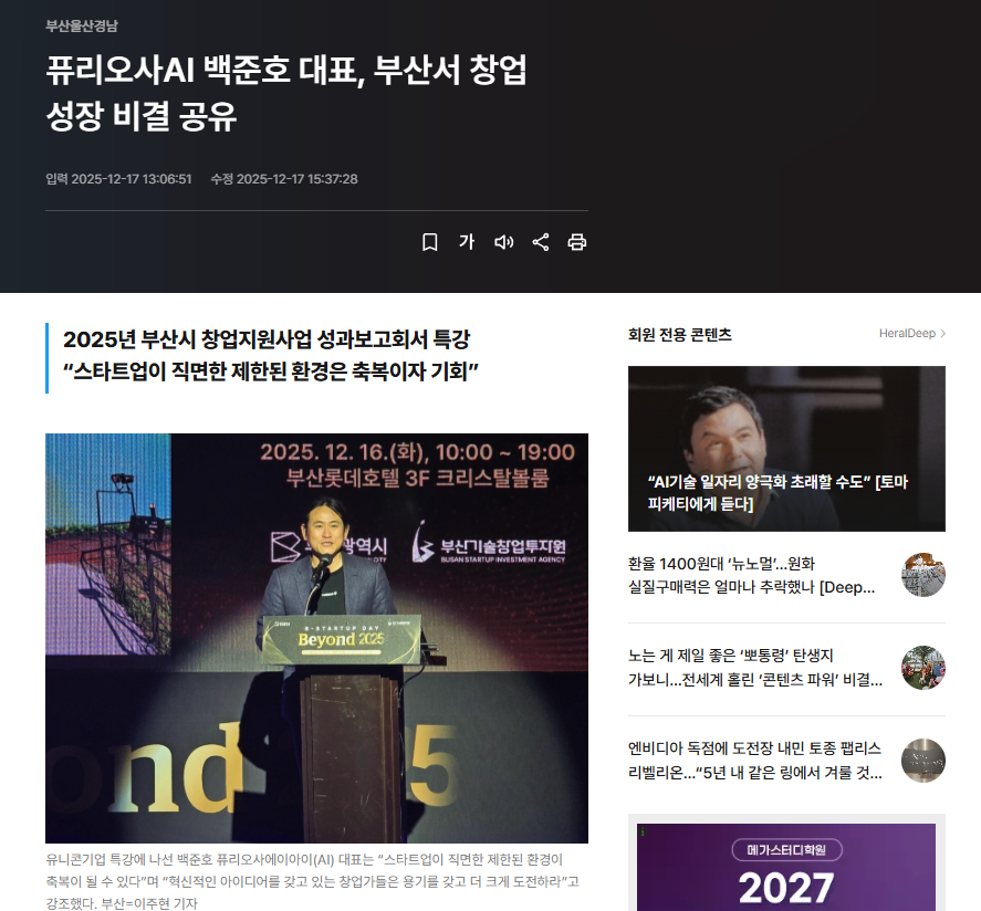 🎤 백준호 대표 "전기 끊기던 시절이 오히려 축복이었다" 13억으로 시작해 1조 유니콘이 되기까지, 위기를 기회로 바꾼 '매드맥스' 정신 (헤럴드경제)